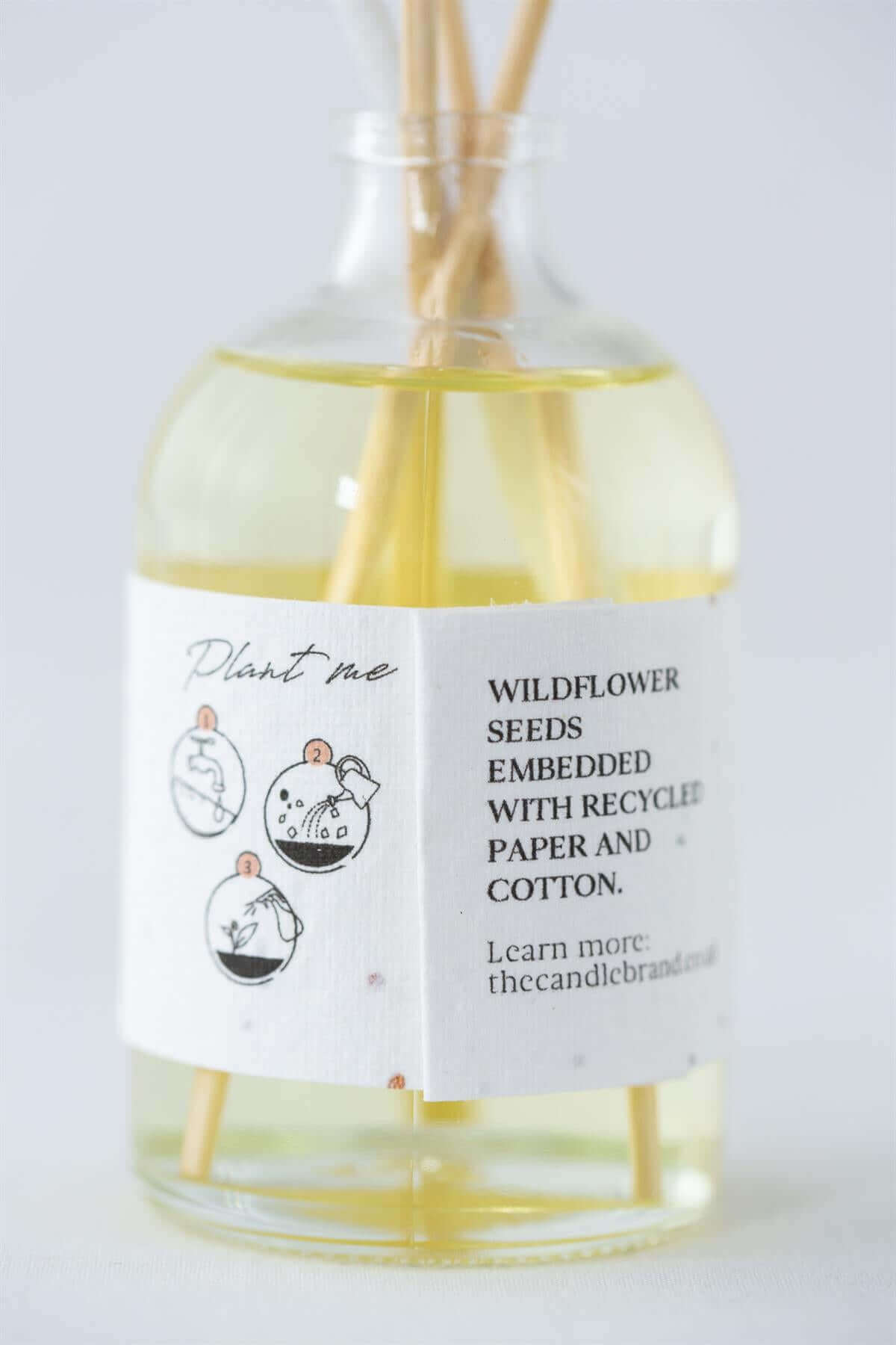 A uniquely fragranced flower bouquet powered by both reeds and a cotton rope; beautifully displayed in a clear glass vase. Featuring a wildflower seeded label ready to be planted. No more boring reeds, no more messy turning!