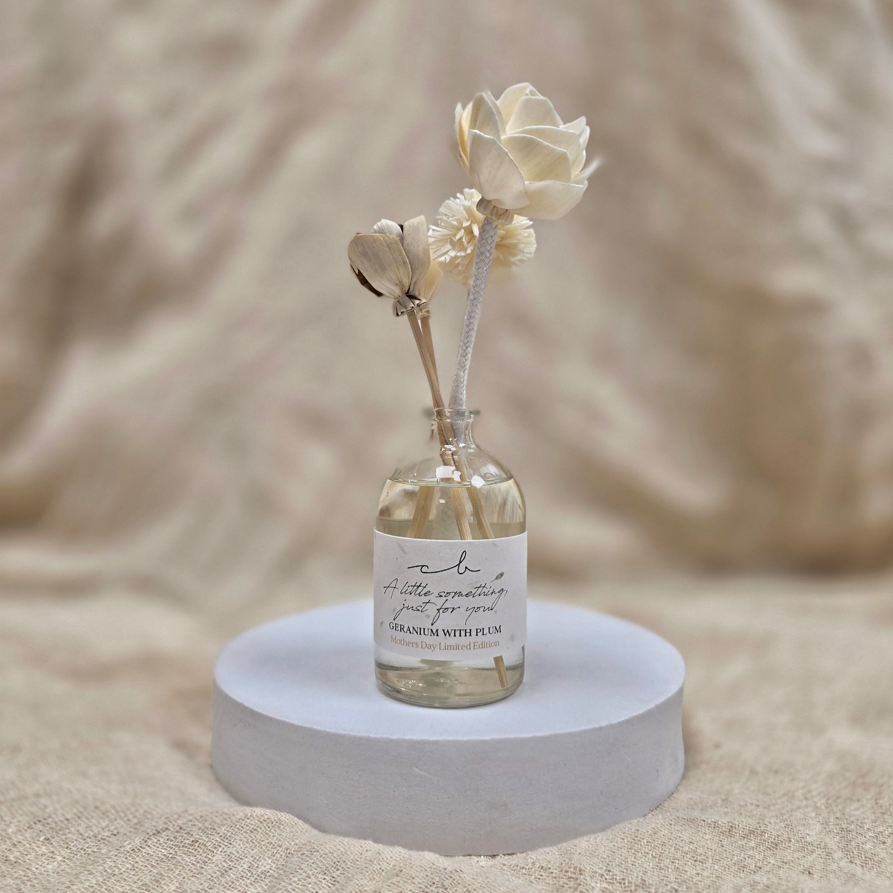Geranium with Plum - A graceful and uplifting fragrance that blends juicy plum with soft geranium petals, balanced by hints of rose and creamy woods.